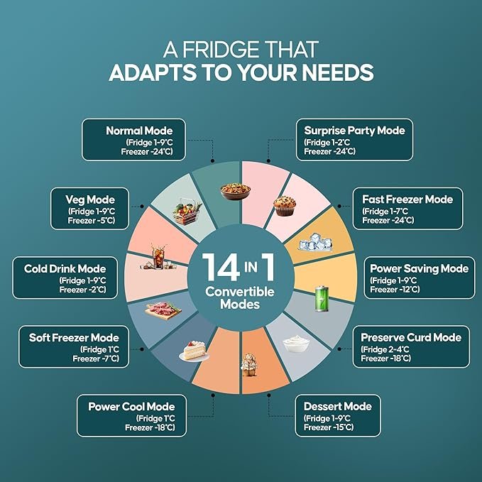 - Frost Free Refrigerator: Premium auto defrost with powerful cooling and long lasting freshness and performance. Manage your flexible storage needs with convertible 14 in 1 technology of this double door fridge: Normal Mode | Veg Mode | Cold Drink Mode | Soft Freezer Mode | Vacation Mode | Power Cool Mode | Power Saving Mode | Surprise Party Mode | Turbo Mode | Holiday Mode | Freezer Mode | Preserve Curd Mode | Snow Beverages Mode | Dessert Mode.